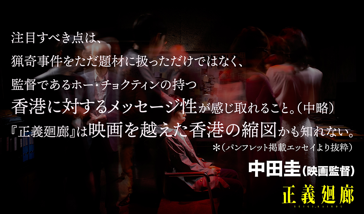 2人の被告人を鳥肌ものの演技力で演じたのはヨン・ワイロンとマク・プイトン。脇を固めるのは、ベテランのルイーザ・ソウやマイケル・チョウ、若手女優ジョン・シュッインら。そして香港最高の清純派女優とも言われたグロリア・イップが久しぶりに登場するのもファンにはたまらない。社会性とエンターテインメント性を兼ね備えた作風で注目を集めるホー・チョクティン監督が、事件とその法廷を鮮やかな構成で描ききった。